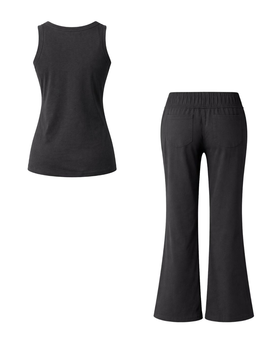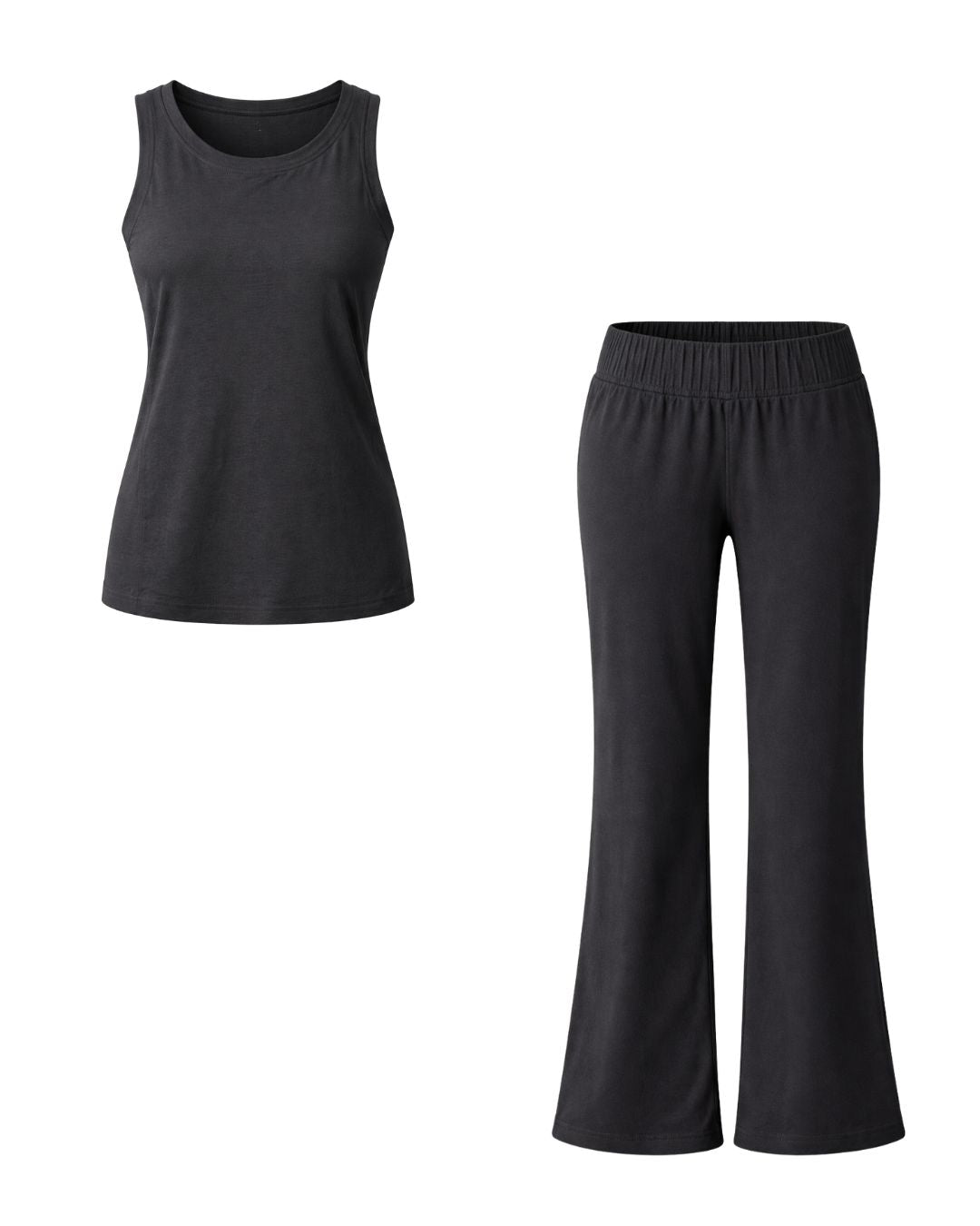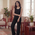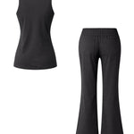 This black co-ord set features a structured sleeveless muscle tee paired with high-waisted wide leg pants, creating a flattering and elongating silhouette. Whether you're heading to the airport, stepping out for coffee, or lounging in comfort, this versatile two-piece set blends athleisure and minimal chic perfectly.