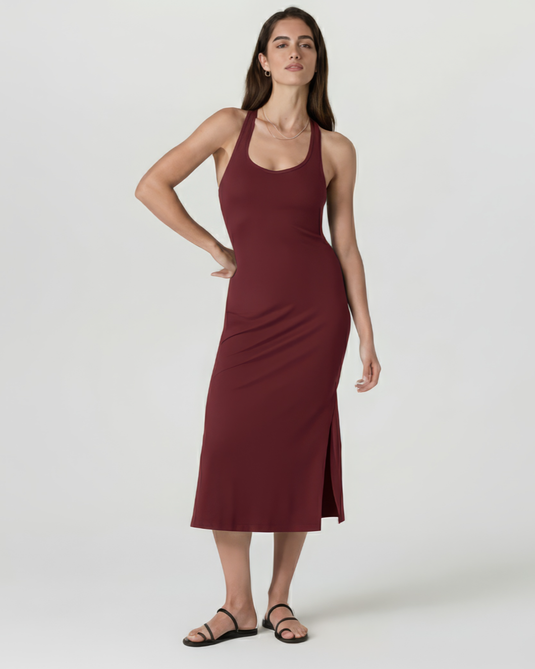 The Halo Racerback Dress is all about lasting comfort and effortless style. Designed with our oh-so-soft Cotton Lycra made from recycled materials, this midi dress has a racerback, curved V-neck.