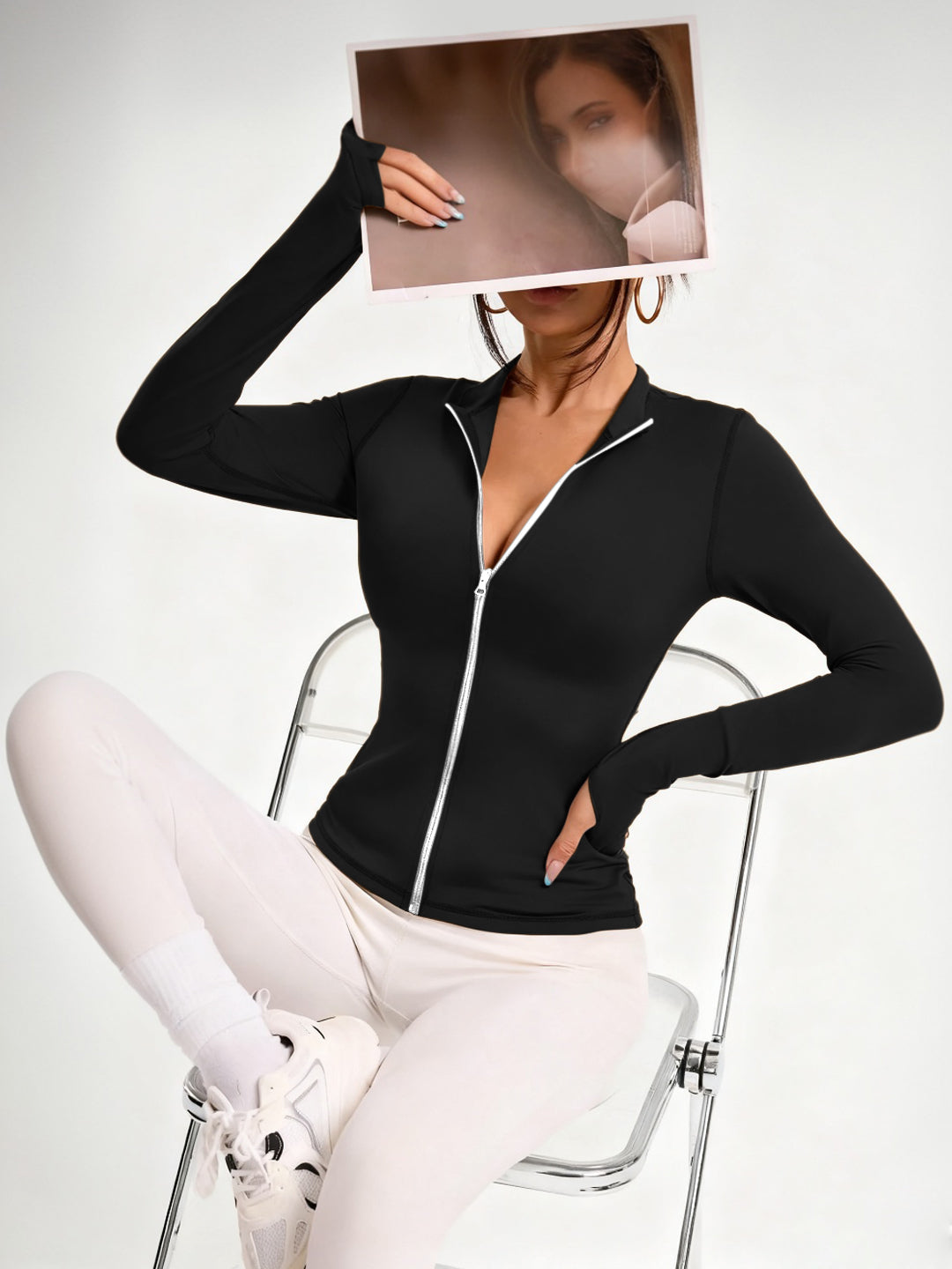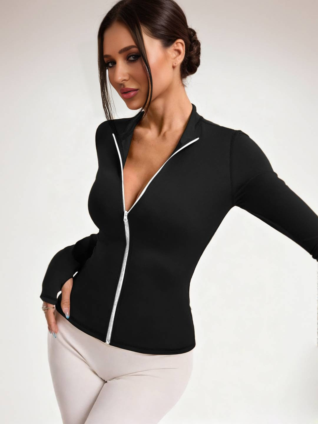 • Thumbhole sleeves for an athletic, streamlined finish