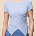 The Sky Snatch Wrap Tee is where comfort meets snatched energy. With its sculpting wrap-front detail and lightweight stretch fabric, this pastel blue dream hugs your curves while keeping it breezy. Perfect for pilates, yoga, coffee runs, or just serving clean girl aesthetic all day.
