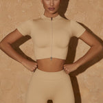 The seamless zip tee delivers lightweight compression with breathable stretch, allowing full mobility through sled pushes, lunges, and high-intensity intervals. The high-waist seamless shorts provide sculpting support and stay securely in place during explosive movements and sprint efforts.